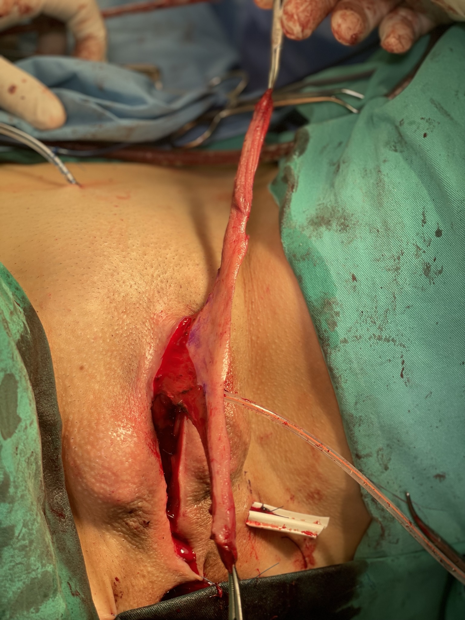 Reconstruction of the neourethra starts with reconstruction of its bulbar part. A vaginal flap is harvested from the anterior vaginal wall with the base close to the female urethral meatus. This flap is joined with the remaining part of the divided urethral plate forming the bulbar part of the neourethra. Additional urethral lengthening is performed using all available vascularized hairless tissue to lengthen the neourethra, maximally preventing the postoperative complications. For this reason, both labia minora and available clitoral skin are used for urethral tubularization. This way, the new urethral opening is placed in first half of neophallus, minimizing the requests for longer neophallus urethroplasty. It is always done in the first stage of total phalloplasty.