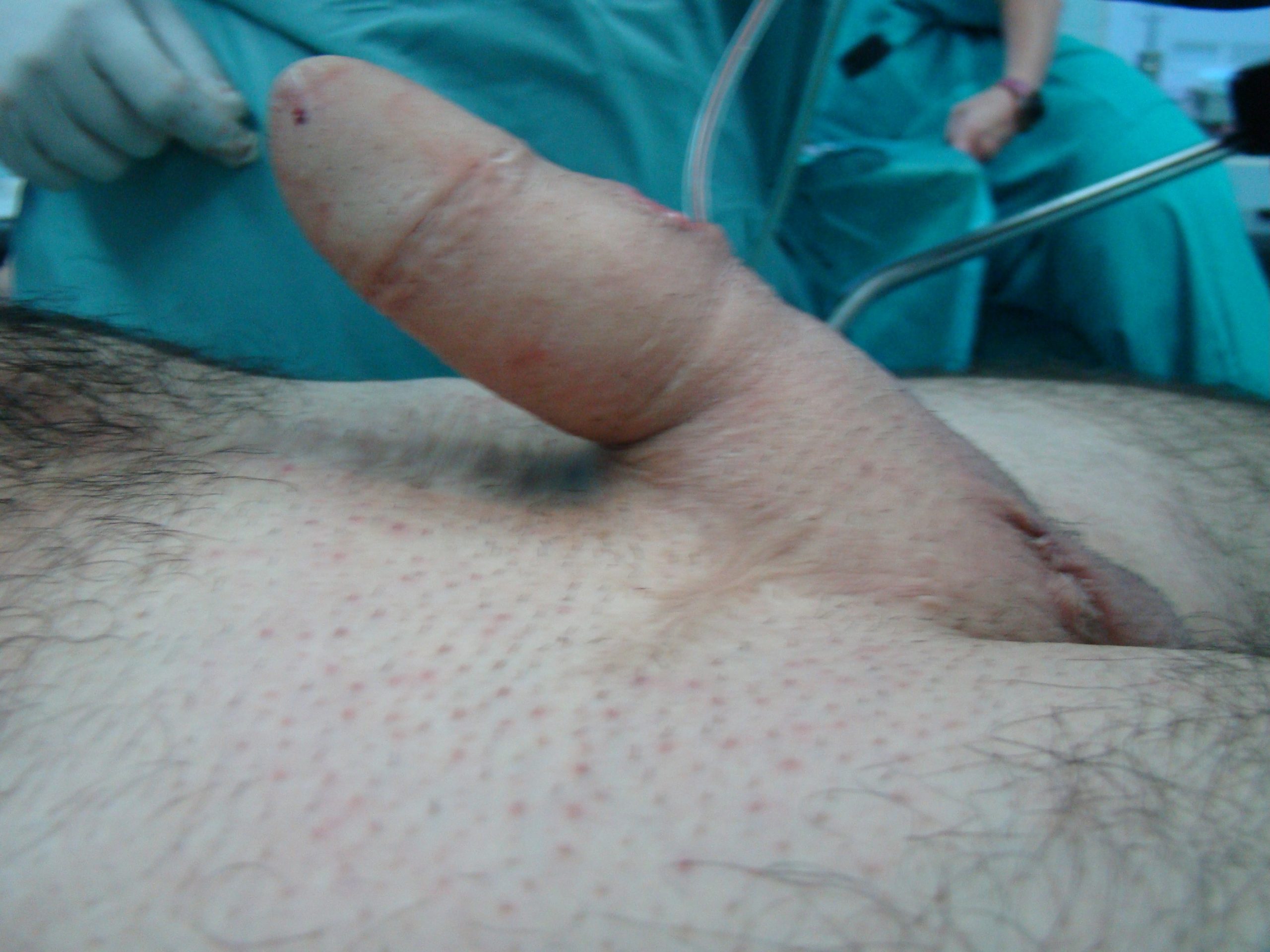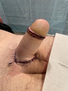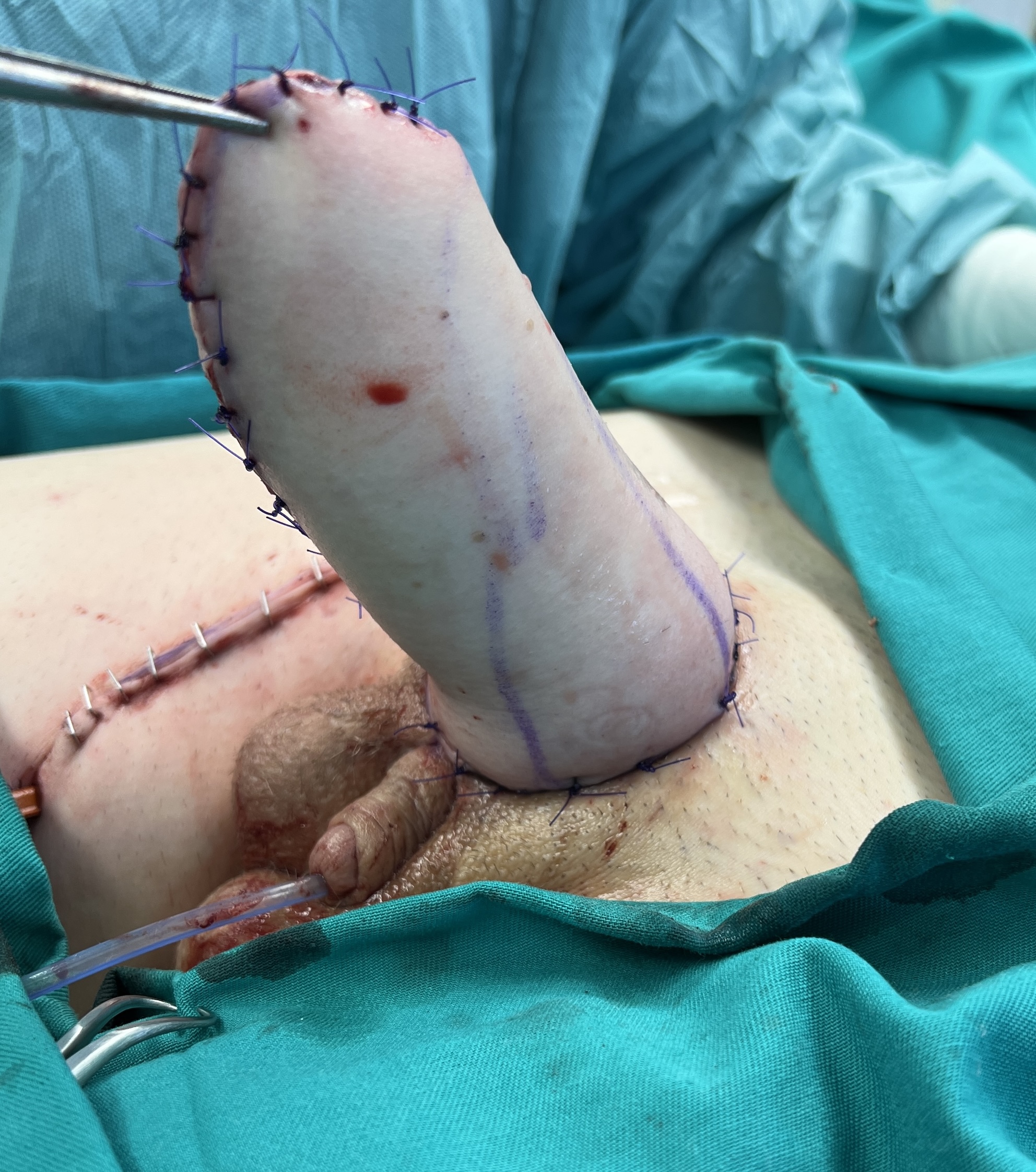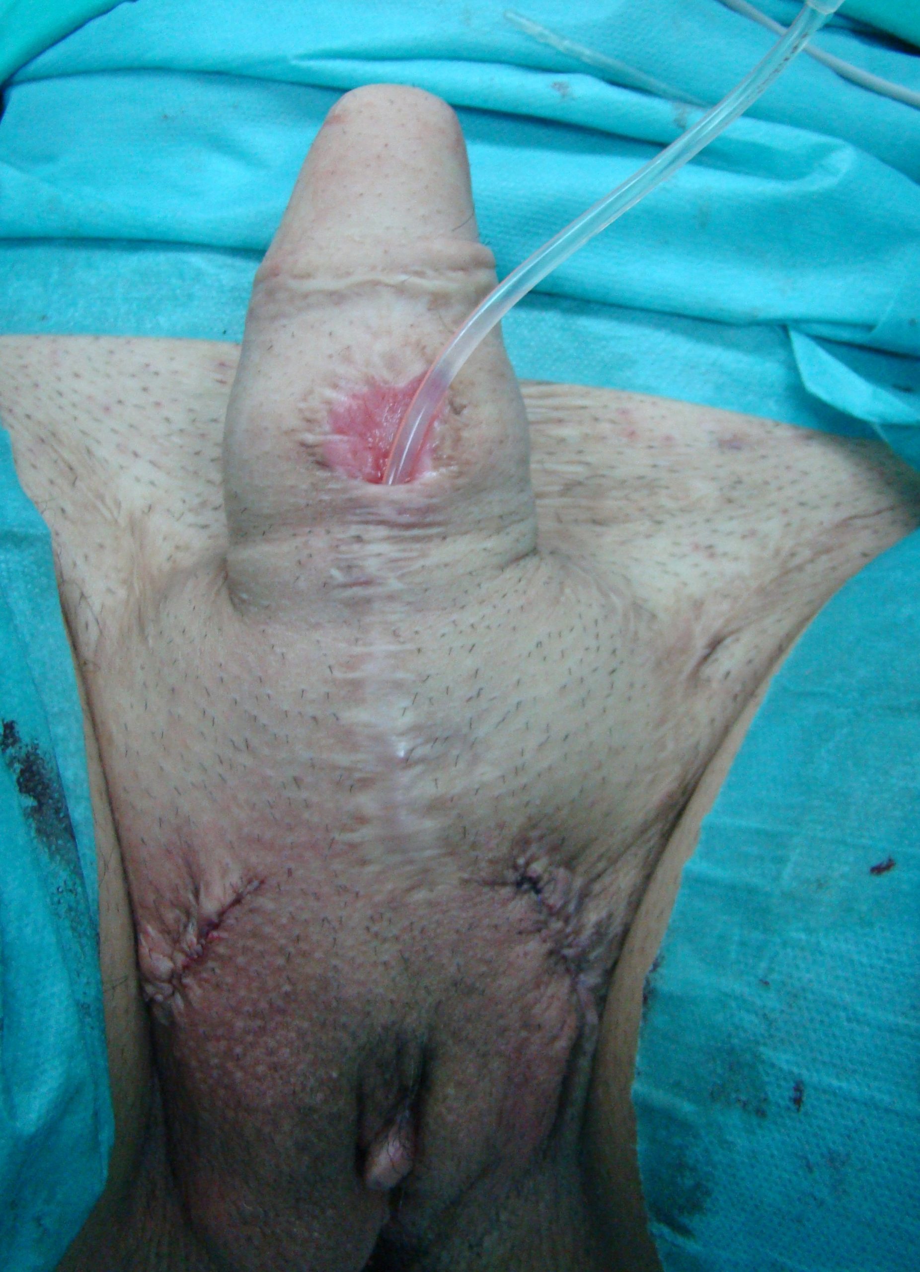 Postoperative outcome. Urethral lengthening is done to the proximal part of the neophallus.