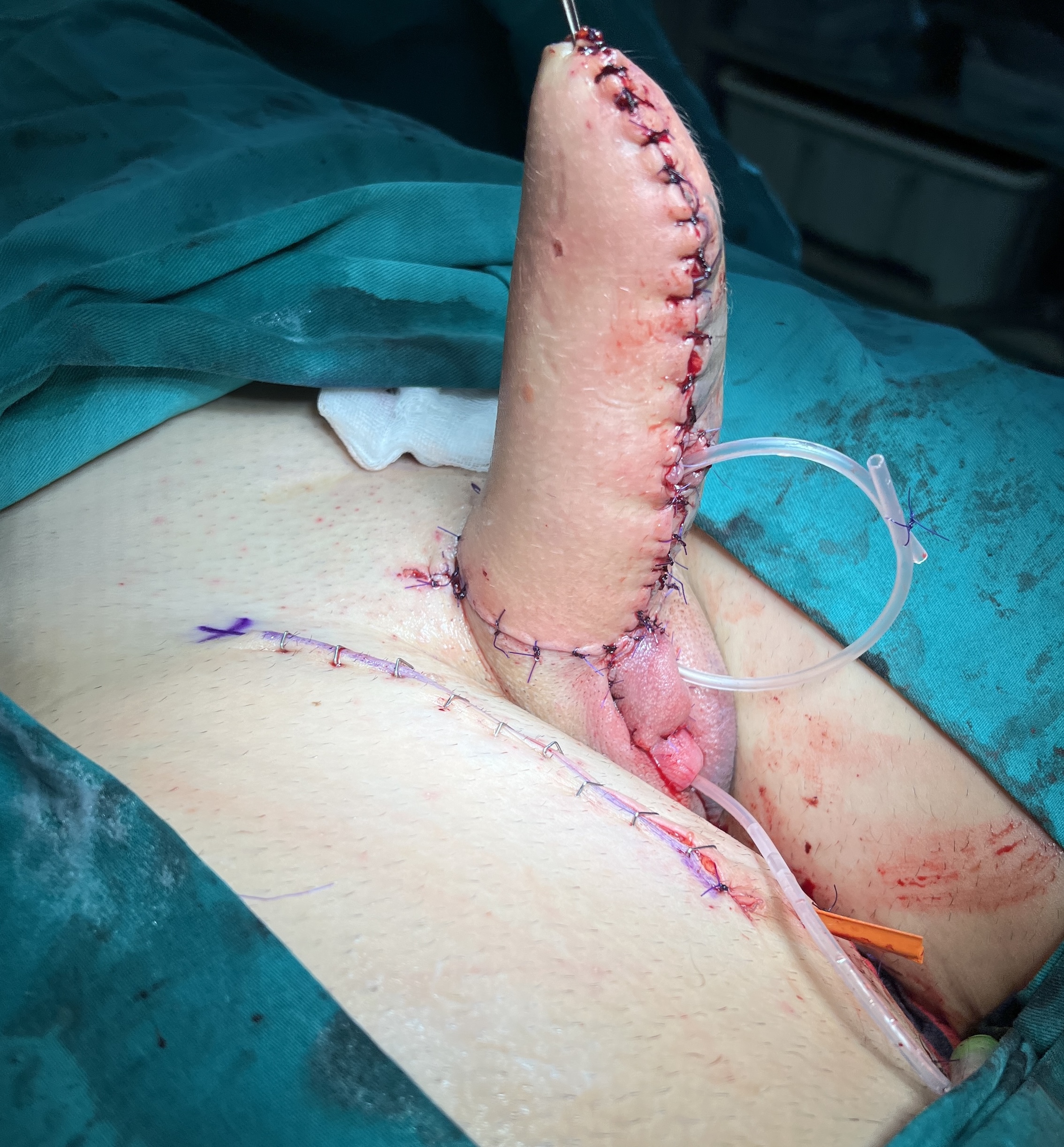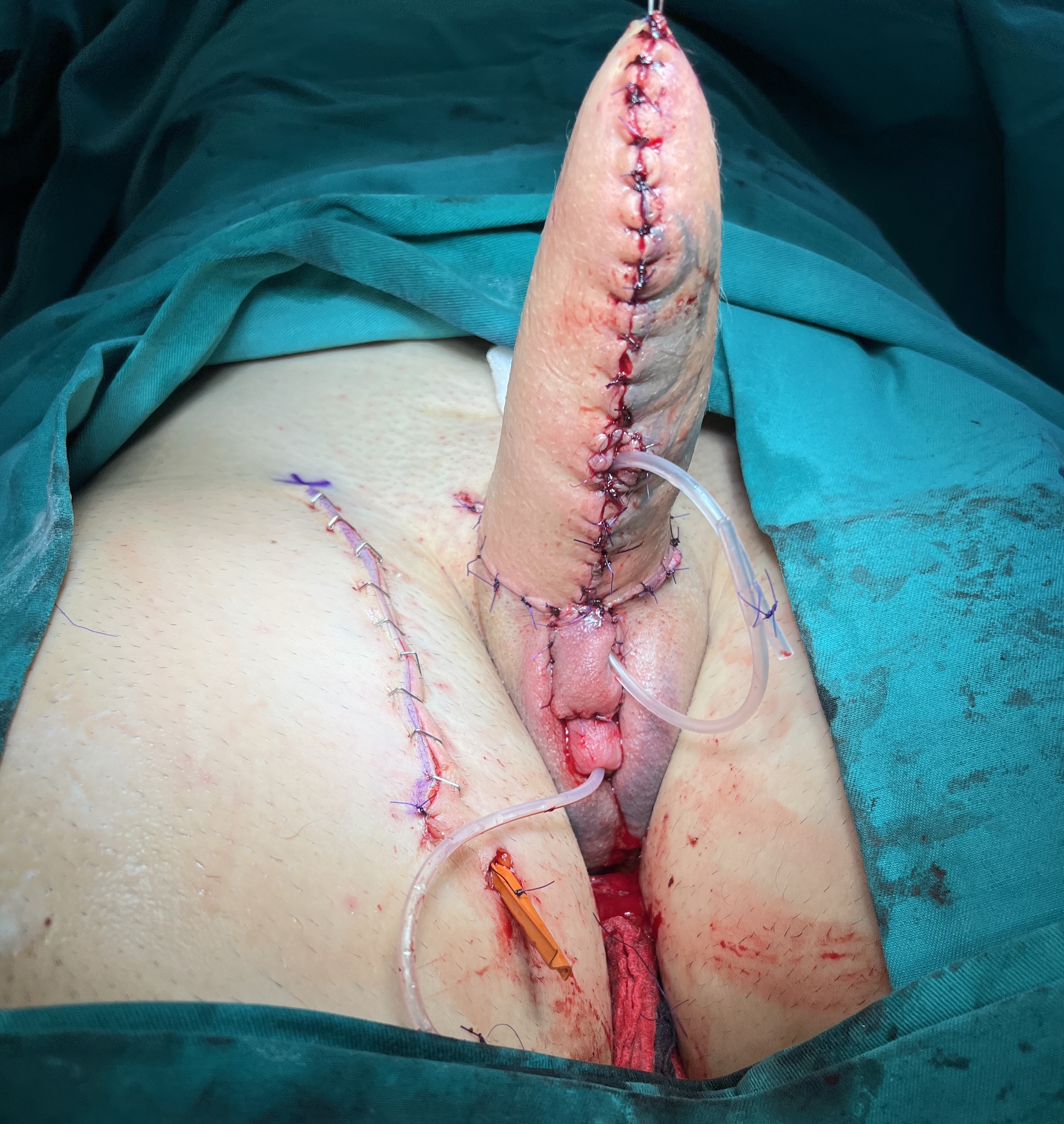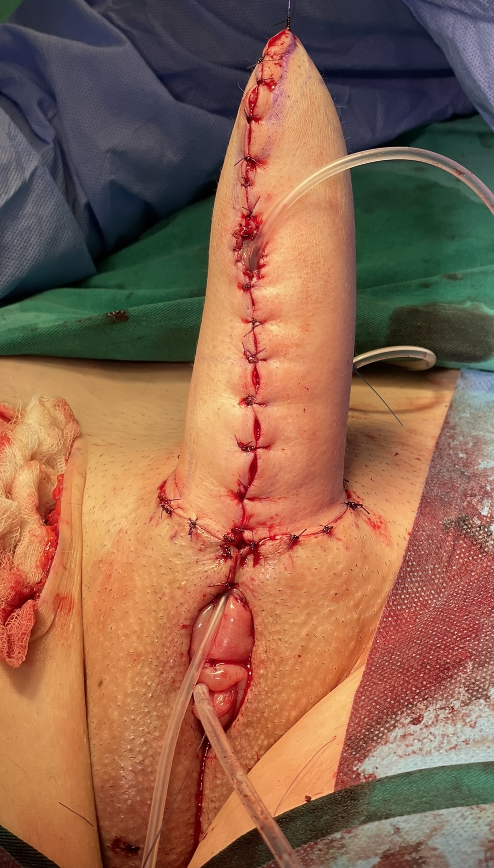 Postoperative outcome. Urethral lengthening is done to the proximal part of the neophallus.