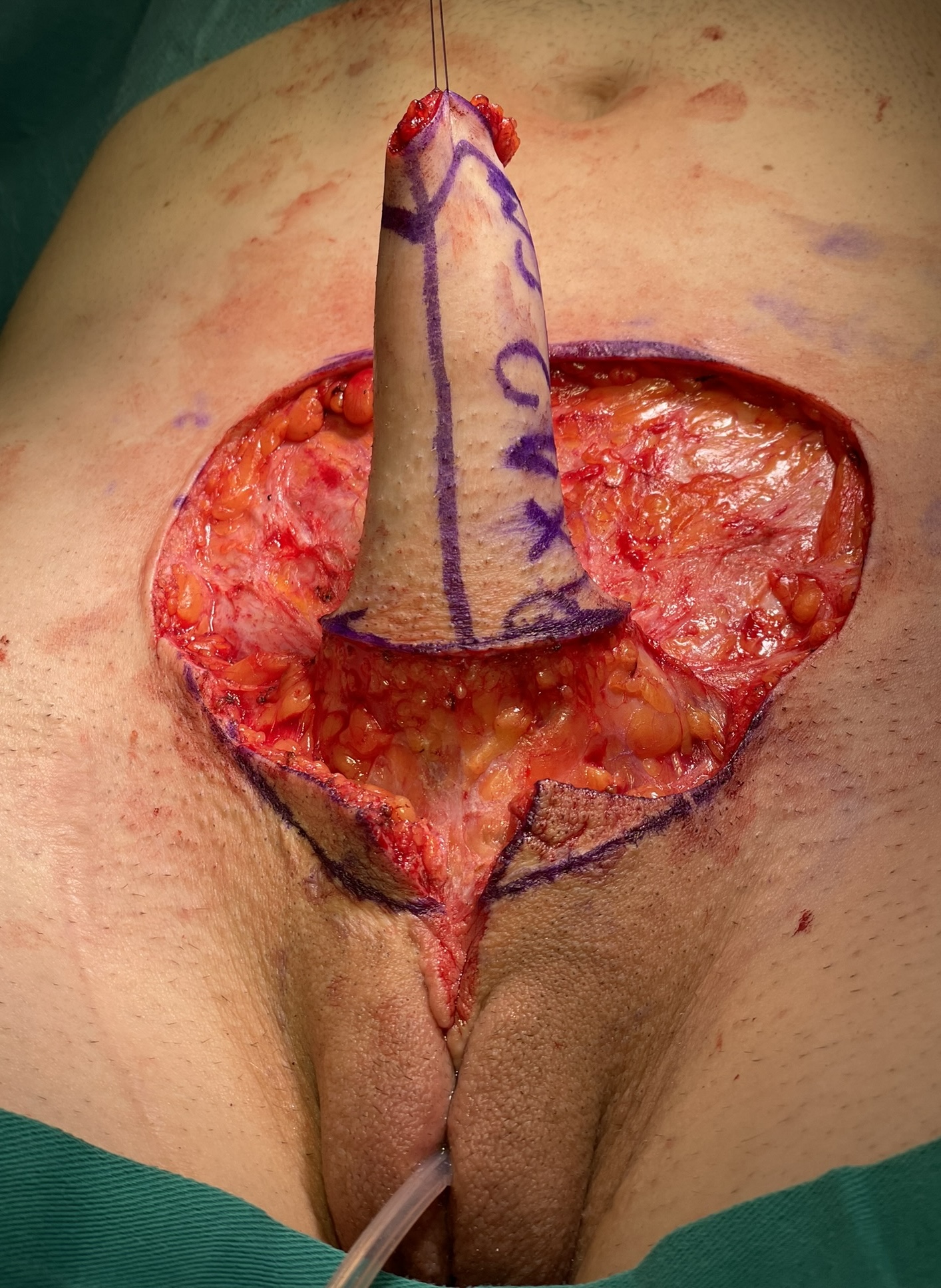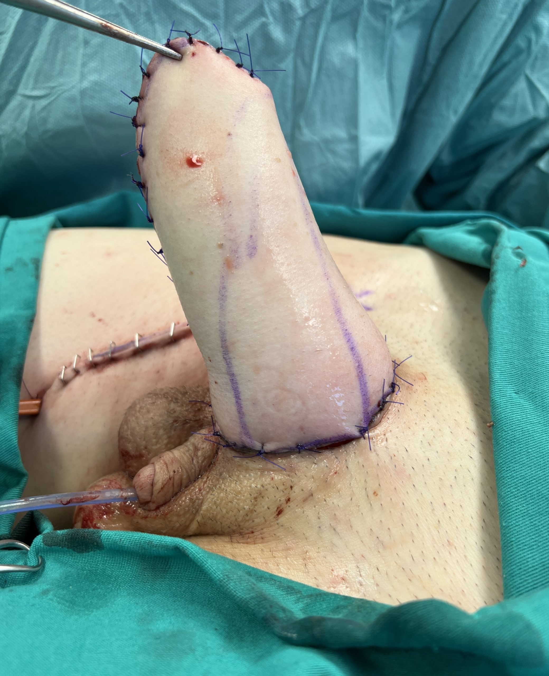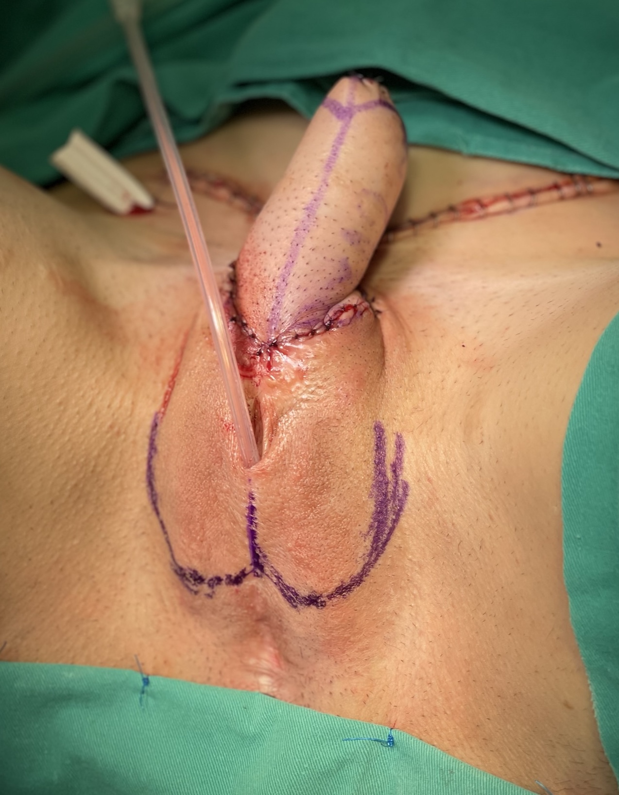 2. Lengthening of the urethra using all available vascularized hairless genital skin.