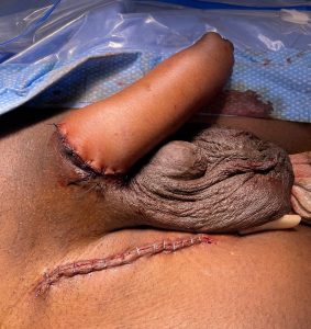 Outcome after surgery. Scrotum with two testicle prostheses is formed. Neophallus is fixed just above the scrotum. Clitoral glans is placed under the base of the neophallus